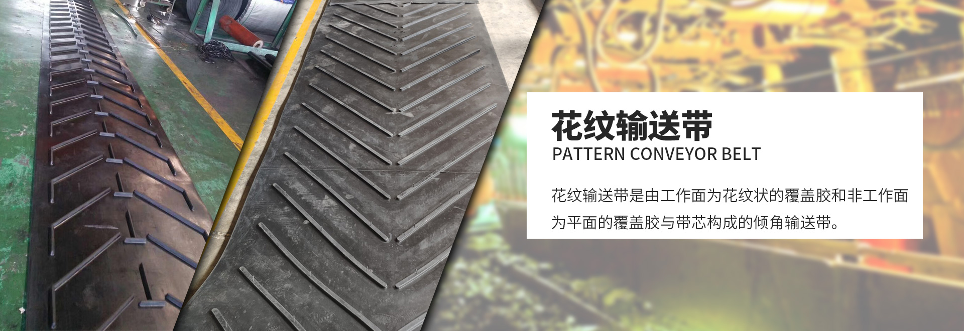 花纹输送带是由工作面为花纹状的覆盖胶和非工作面为平面的覆盖胶与带芯构成的倾角输送带。